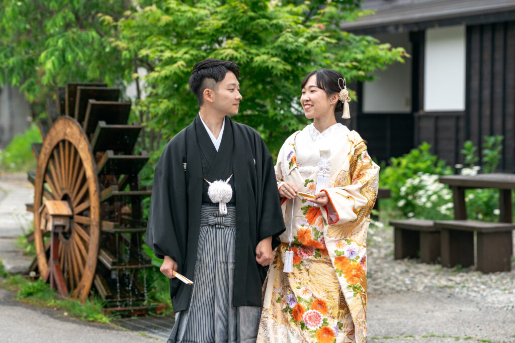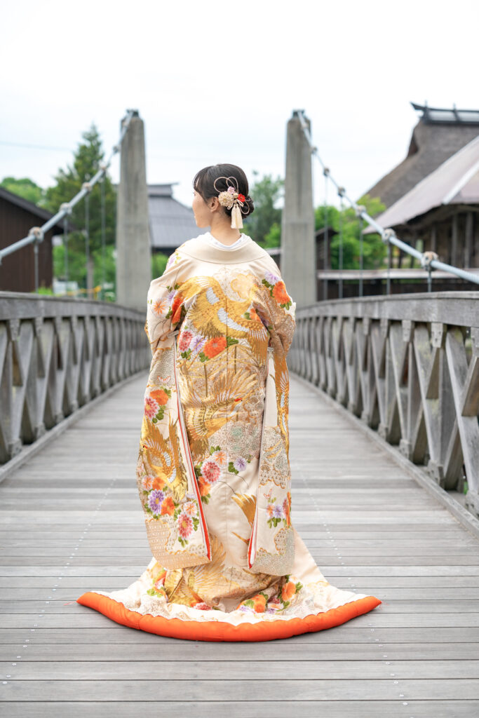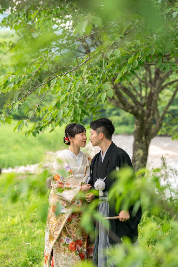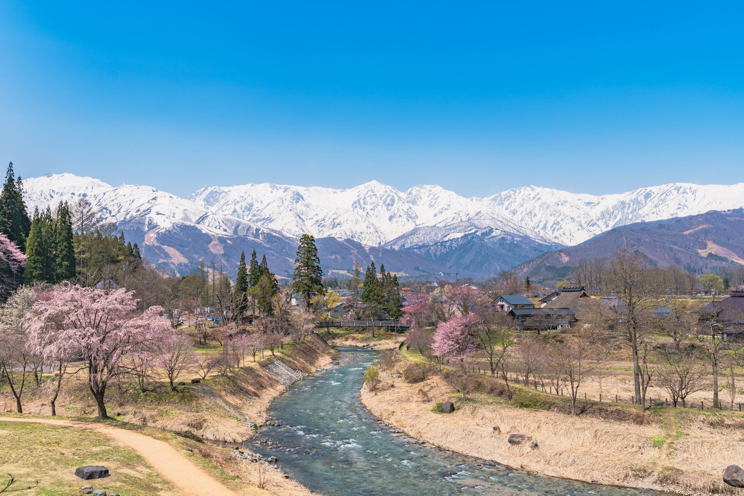 北アルプスを背景に、姫川に架かる吊り橋と古民家が調和する風景は、白馬らしい原風景。